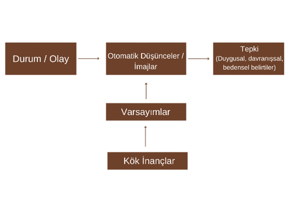 Belirli bir durum karşısında genellikle aklımıza hızlı bir şekilde ve biz farkına varmadan bazı otomatik düşünceler gelir. Bu düşünceler, görüntü (imaj) şeklinde de olabilir. Aklımıza gelen otomatik düşünceler, o an nasıl hissettiğimizi, bedensel belirtilerimizi ve davranışlarımızı etkiler. Örneğin, bir kişi arkadaşının ona selam vermediği bir anda “Beni artık umursamıyor” şeklinde düşündüğünde; o an üzgün hissedebilir (duygusal tepki), vücudunda halsizlik, bitkinlik olabilir (bedensel belirti) ve ağlayabilir (davranışsal tepki). Diğer bir yandan, başka bir kişi aynı durumda “Acelesi var galiba beni görmedi” şeklinde düşündüğünde sakin hissedebilir (duygusal tepki), bedeni olağan şeklinde işleyişine devam eder (bedensel belirti) ve daha sonra onu gördüğünü söylemek için arayabilir (davranışsal tepki). Başka bir deyişle, yaşanılan duygu ve davranışların temel nedeni, durum ya da olayın kendisi değil; o duruma verilen anlamdır. Kognitif Modele göre düşünce, duygu, bedensel belirti ve davranış alanları birbirleriyle etkileşim içerisindedir.